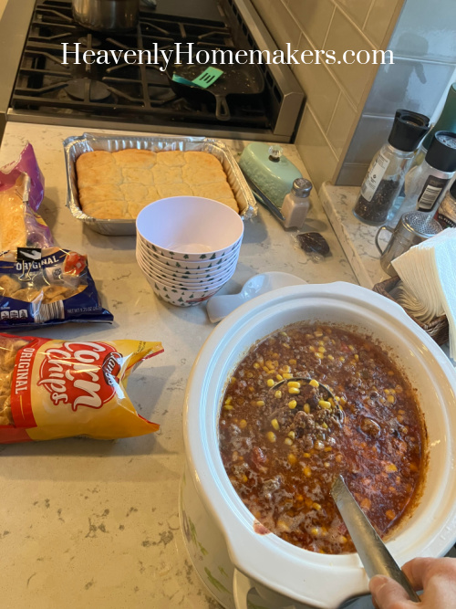 Before I left, I’d filled a crock pot with Taco Soup. This was a perfect way to feed everyone after school and as the evening progressed with homework, ABA therapy, and keeping everyone settled. Our friend, Elicia, had made Homemade Rolls that were supposed to have gone with our Sunday Lunch that we’d canceled due to Acacia’s illness. She handed them to those who were at church on Sunday morning, and we enjoyed them with our soup Monday night!
