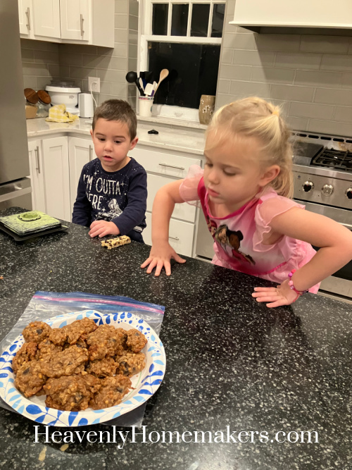 On Tuesday morning, I pulled a plate of Angela’s Banana Chocolate Chip Breakfast Cookies from the freezer to feed the kids before school/therapy.