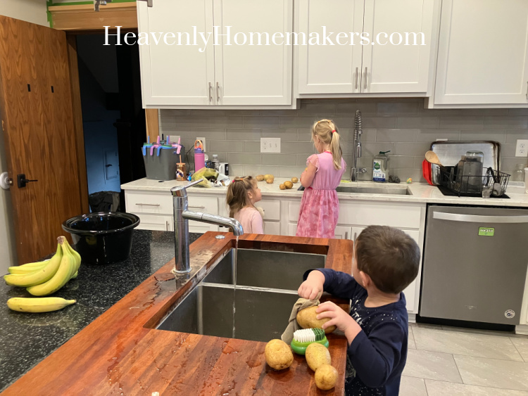 Acacia, Josie, and Auggie helped me scrub a crock pot full of potatoes for dinner.