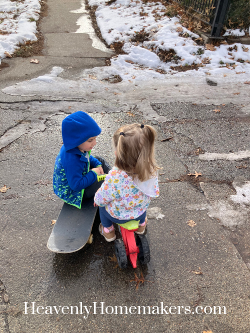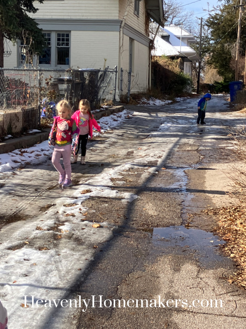 The girls played with Little Sweetheart and Auggie had ABA therapy all morning. Then we put on jackets and went outside to play until the bus came. Temps in the 50s in December? Yes, please! They “ice skated” in the alley behind our house.
