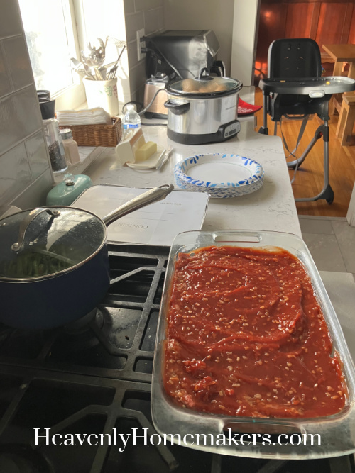 That afternoon/evening was a BIG one. I put together a 3.5 pound Meatloaf and Steamed Green Beans. Plus our Baked Potatoes were cooking in the crock pot. I left all of that to Matt while I took Brayden to our weekly Food Distribution.