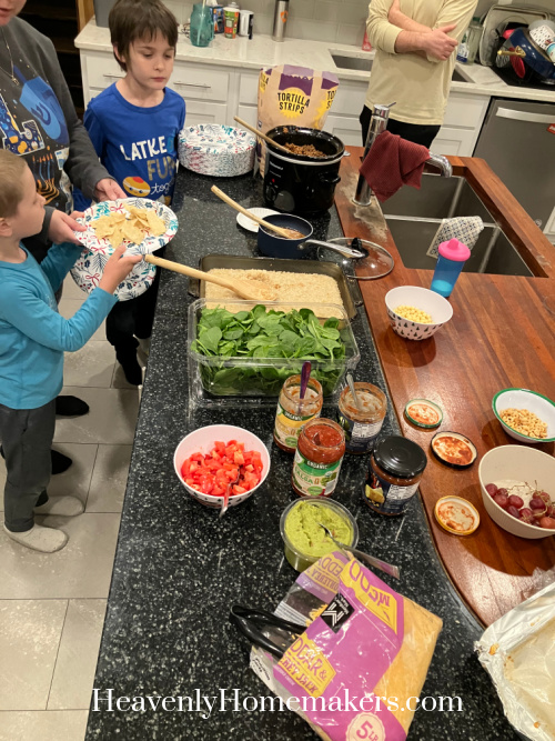 I made a Nacho Bar with Chips, Seasoned Meat, Stick of Butter Rice, Tomatoes, Cheese, Spinach, Beans, Salsa, and Guacamole.
