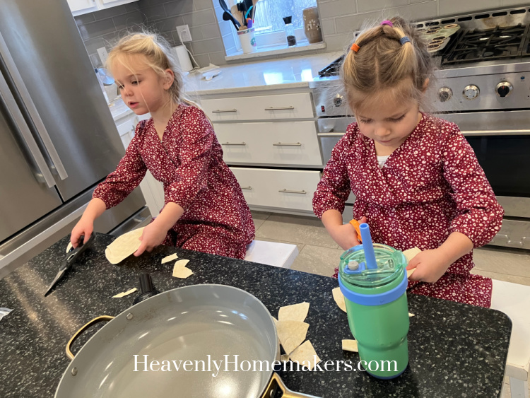 The girls wanted to wear their matching Adoption Day dresses (that are almost too small, but now they work like shirts with pants). They also had a fun idea to cut tortillas “like we did at Ms. Kathi’s!” and melt cheese on top. This was a very fun and tasty morning activity.