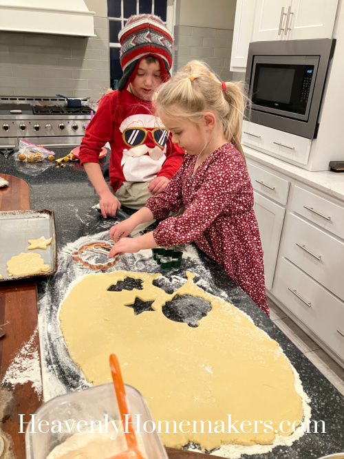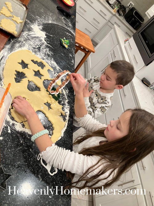 The main highlight of the night is that I’d mixed up a quadruple batch of Cream Cheese Sugar Cookie Cut Outs. We took turns rolling and cutting and baking our cookies. Phew, it’s a big job with this many helpers! But the kids love this and it’s a Christmas tradition. This is the best way I’ve learned to make cookies like this with our kids.