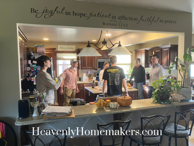 Early in the afternoon, I worked for a while to get ahead in the kitchen. I made a pan of Simple Pizza Chicken Bake for Matt to bake at dinnertime. I also cooked some chicken separately in a pan so that I could add it to Monday’s broth for soup. And I cooked twelve hamburger patties for our lunch the next day. The kids would be home for six days for Thanksgiving break, so getting ahead put my mind at ease a bit.