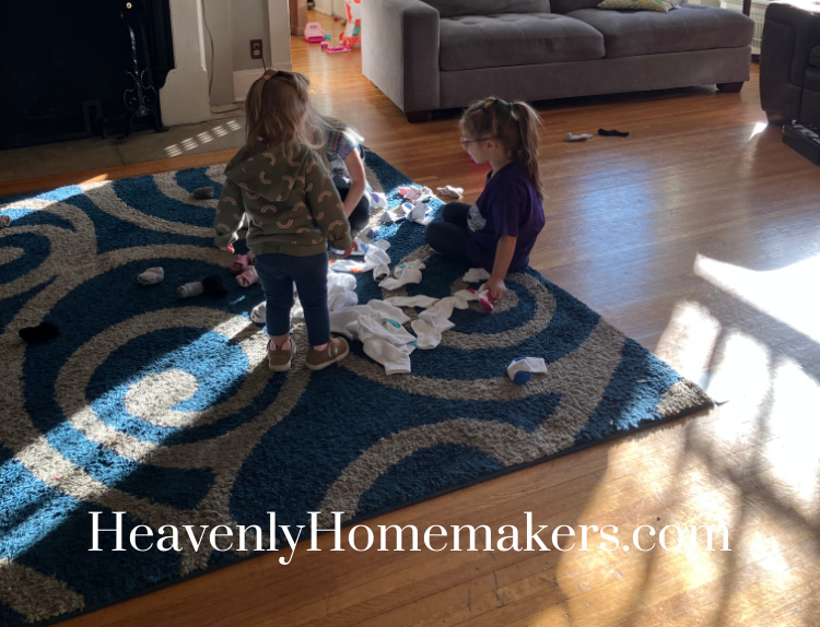 On Tuesday, the girls discovered the new packages of socks I’d gotten for them. Little Sweetheart was over so she helped them put the pairs together. This was a grand activity.