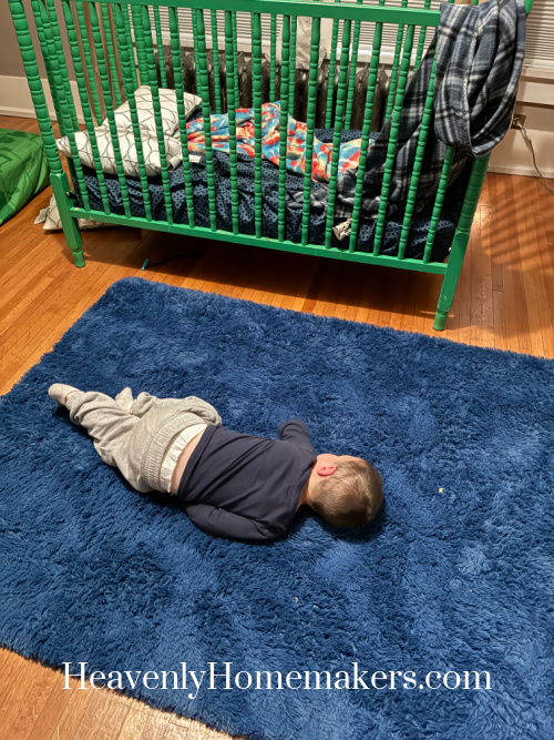 When it was time to get Auggie up from his nap and pick kids up from school, Matt found him asleep on his soft rug like this. I think we are almost done with our crib. :)
