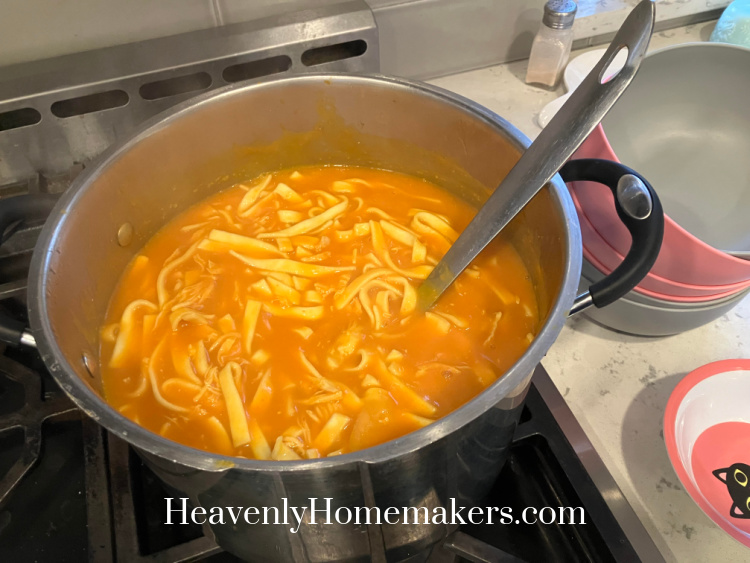 We keep decorations pretty simple. Yet, the job is still exhausting. So I was very grateful that all I had to do for dinner was pull out the broth and chicken I’d made ahead of time, boil, and add noodles. Chicken Noodle Soup was a perfect dinner that night!