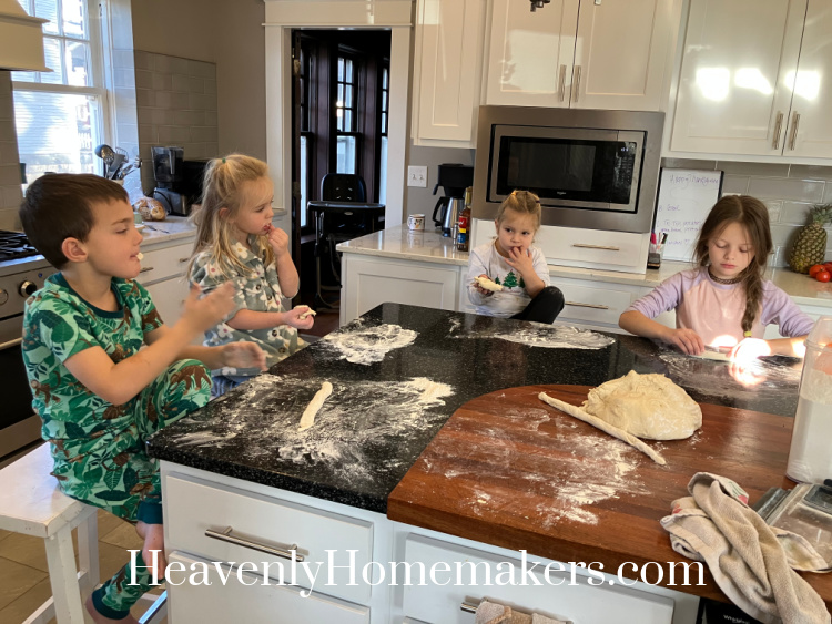 Matt had joked that since I wasn’t cooking a big turkey feast for the day that I should instead make Homemade Soft Pretzels. He was totally kidding, yet I decided that this would be a lovely (and delicious) project for all of us. (He decided to joke about me making Sausage Stromboli next to see if he gets the same results, ha.) The kids loved playing with their dough!