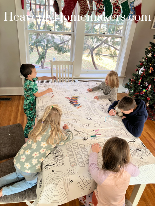 I’d found a paper coloring and activity Thanksgiving tablecloth on clearance and laid it out on our living room table. This was a very fun thing to do here and there throughout the day.