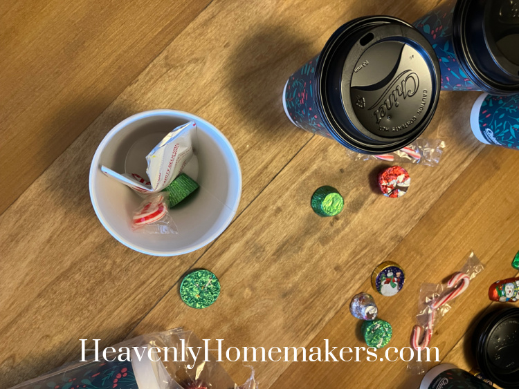 We simply used a fun, festive cup with lid and put in a hot cocoa packet, a small candy cane, and a chocolate.