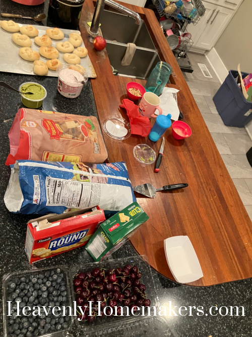 I set out some munchies for us to eat for dinner: Meatballs, Pretzels, Chips/Dips, Blueberries, and Cherries.