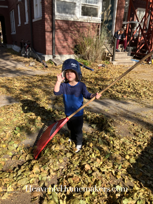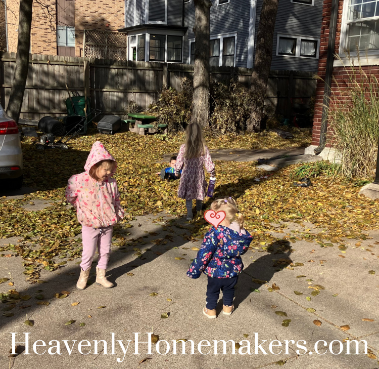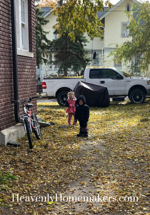 I don’t have any pictures from our morning, but it was wonderful to spend time with the Back to the Bible crew! When we got home, the kids were outside with Emma playing in the leaves. Auggie had decked himself out in his coat and Brayden’s huge boots. He was very proud!