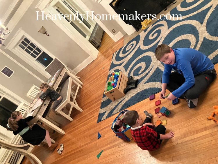 That evening was especially rough. One of our kids had a meltdown that basically lasted from the time we picked kids up from school until it was time to go to bed. The others took turns melting down, so there was screaming and yelling in our house all evening long. Through it, on my way to the couch with a sad/mad kiddo to try and sit and help them calm their body down, I captured this scene, which only looks like we all sit and color and play magnatiles calmly in the evenings, ha.