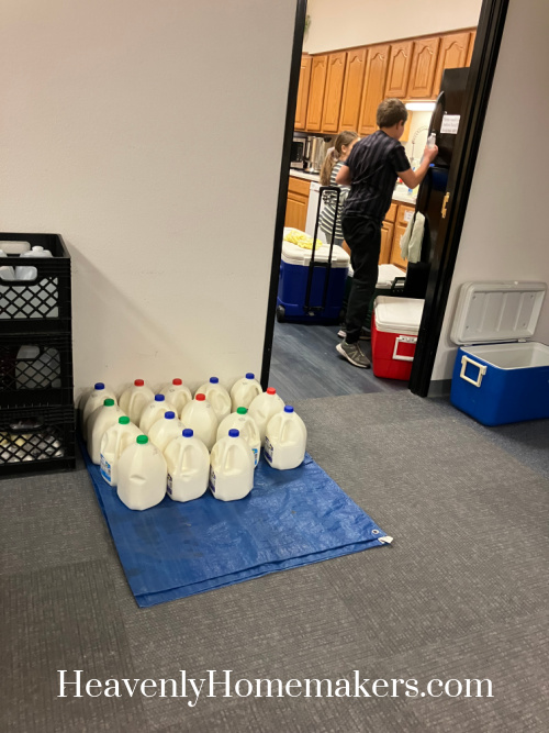 I took Brayden and Kiya to hand out food and clean with me at our weekly Food Distribution while Matt held down the fort with the other kids at home. As we expected, many more people came through the food line that day than we have had in the past. Thankfully, we had lots and lots of food that had been donated that we could hand out to people. As clients were making their way through to each food table, someone came in with jugs and jugs of milk for us to hand out – wow! So almost everyone who came through got a gallon of milk as a bonus. This was great to see!