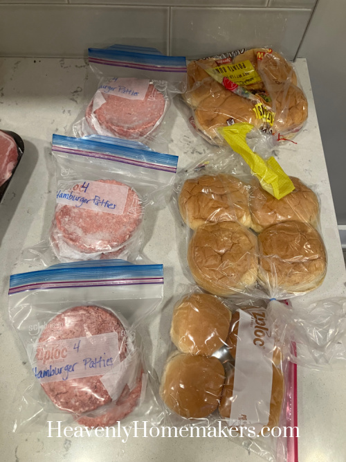 On Wednesday morning, while the kids were eating breakfast, I packaged up some hamburger patties and buns to put into our Little Free Pantry fridge. I’d picked up a pack of 12 hamburger patties on sale, so I repackaged them to provide three families with four burgers. This project has been so much fun!