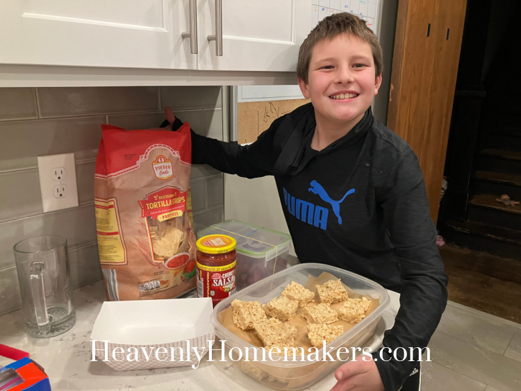 Brayden goes to Youth Group Bible Study on Wednesday evenings and it was his turn to take snacks this week. He helped me come up with his “menu” and he was very excited. He took chips and salsa, grapes, and Rice Krispie treats.