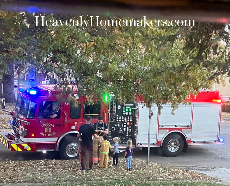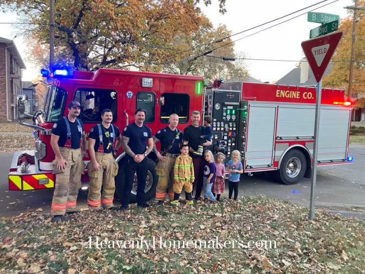 And just who do you suppose drove by our house again that afternoon? More firefighters. They saw Keith in our yard, all decked out in his gear ready to fight fires. So they stopped so that they could take a picture. These men are heroes.