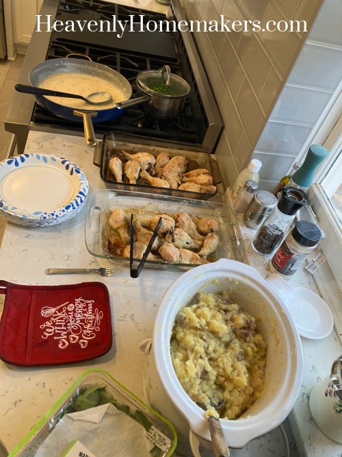 Back at home, I finished putting together a big lunch: Oven Fried Chicken, Mashed Potatoes in the Crock Pot, Gravy, and Buttered Peas.