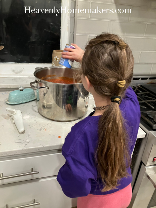 I’d browned ten pounds of hamburger meat that afternoon. Some of it got turned into our dinner. The rest of it got turned into a huge pot of Chili that I planned to serve on Sunday for lunch. Kiya was my Helper of the Day so she worked with me on this project.
