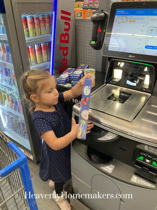 On Friday morning, Matt took Josie and Auggie with him to take the elementary kids to school so that I could leave early with Acacia. Before her therapy appointments, we went to Wal-Mart to get more items for our Little Free Pantry. She was very insistent on helping me scan the groceries as we checked out.