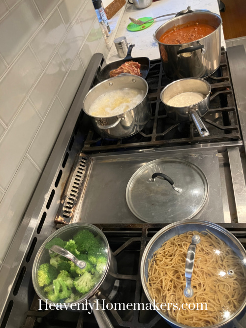 His dinner menu request was: Noodles. That’s it. He just wanted noodles. While that was fine for him (and for five of our other kids), I knew the rest of us would want something with our noodles. So I made both red and white sauces, warmed some bacon to go with white sauce, and steamed some broccoli.