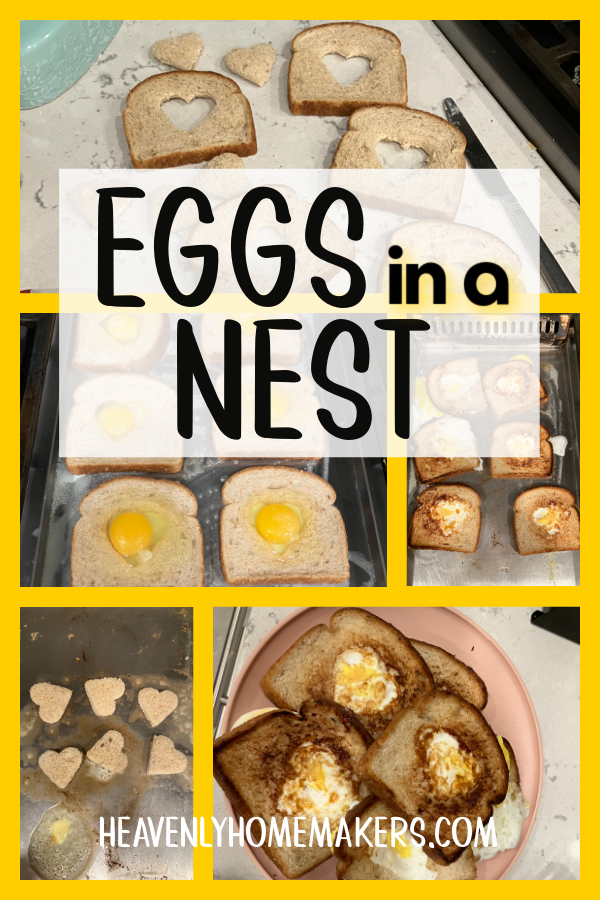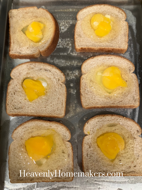 Birds in a nest — and if you lay a slice of cheese over it after you’ve flipped the bread, it’s birds in a nest with blankets! My crew loved the buttered, toasted center pieces as well!