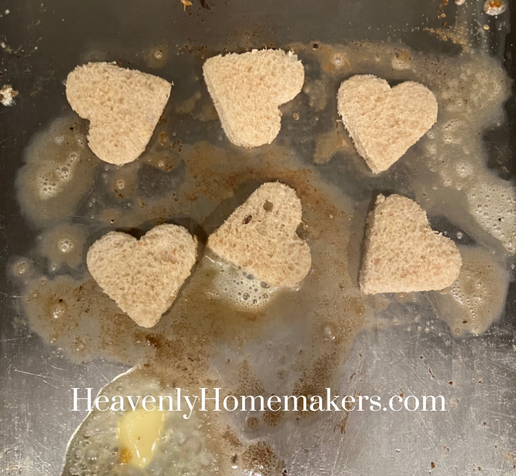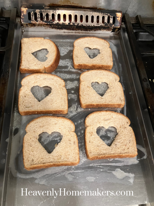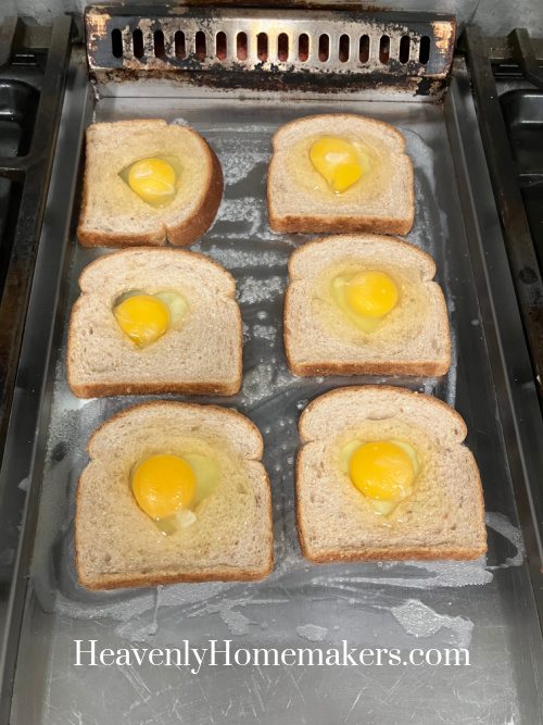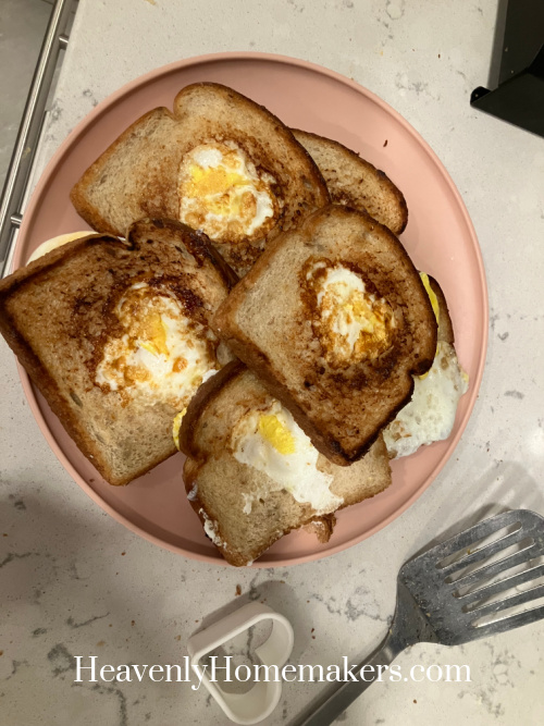 Some of my other tiny picky children skip the Eggs in a Nest and go right for the center pieces. After I cook the above mentioned breakfast, I use the inside cut outs to make buttered toast on my griddle. These get gobbled up so fast that I’ve learned to cut an entire loaf of bread into small shapes and toast them on the griddle for our kids to enjoy.